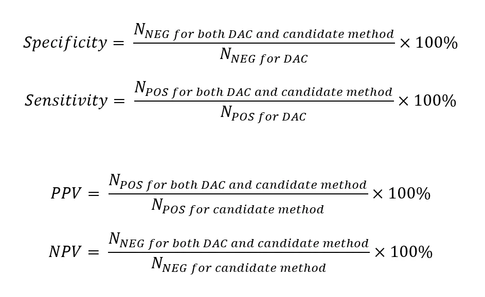 When we use Diagnostic Accuracy Criteria as a reference, we can calculate sensitivity (i.e., the probability that the test will give a positive result to a patient who has the condition) and specificity (the probability that the test will give a negative result for a patient who does not have the condition) of our candidate method. Moreover, we can calculate the positive predictive value (PPV, the probability that a person with a positive test really has the condition) and the negative predictive value (NPV, the probability that a person with a negative test really does not have the condition). The equations are shown below.