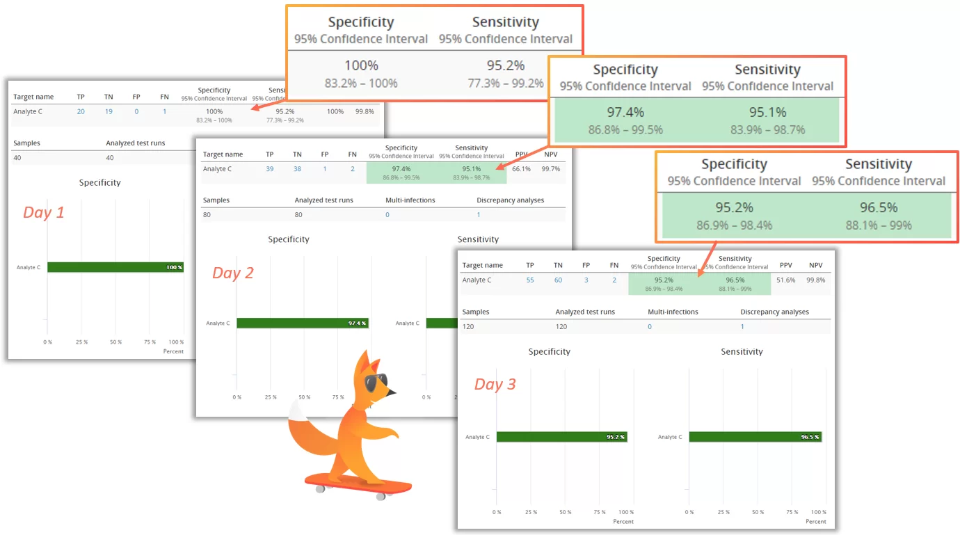 For example when comparing a new method to an old one, having 100% NPA and PPA means that changing the method does not affect the results our laboratory is producing. And if we are comparing two instruments running the same tests, having 100% negative and positive agreement means that we can trust the test to give the same results regardless of which instrument we are using.